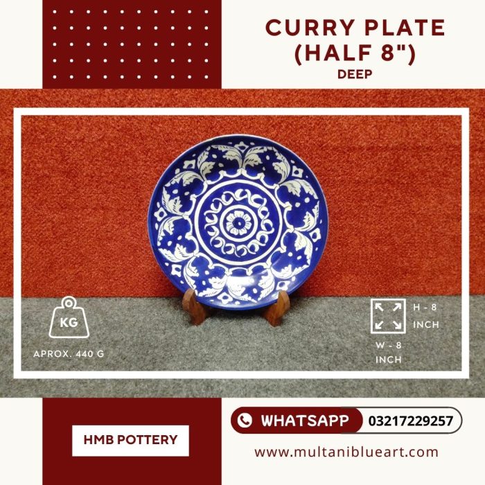 Curry Plate Deep (Half 8 Inch) is a beautifully handcrafted ceramic plate, perfect for serving appetizers, salads, desserts, or side dishes. Adorned with intricate hand-painted Multani Blue Pottery designs, this plate combines traditional craftsmanship with modern elegance. Whether for everyday use or special occasions, it adds a touch of artistry to your dining table.