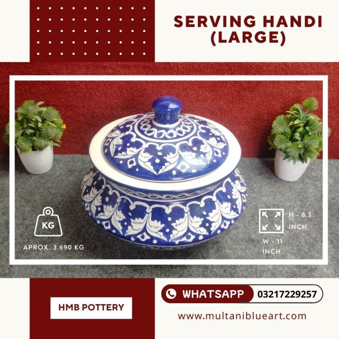 The Multani Blue Pottery Handi Serving (Large) is a handcrafted, traditional ceramic handi, perfect for serving hot and flavorful dishes with an authentic cultural touch. Designed for both home and restaurant use, this handi blends artistic elegance with functionality, making it a must-have for every dining table.