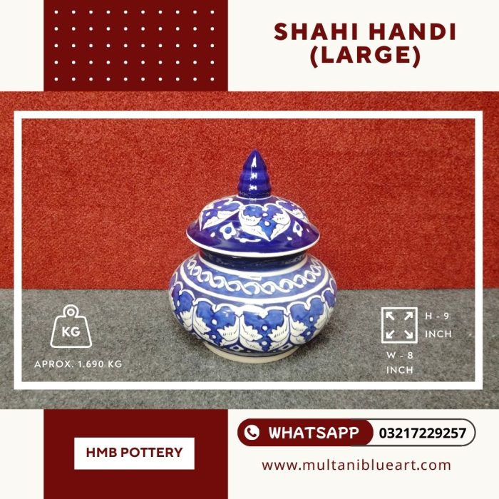 The Shahi Handi Serving in Multani Blue Pottery is a beautifully handcrafted dish that brings a touch of royal elegance to your dining experience.